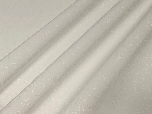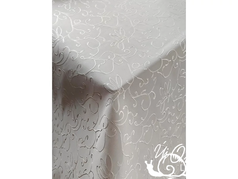 Nagyon elegáns, törtfehér vízlepergetős abrosz anyag. Mintázata egyszerű, mégis biztosítja az anyag enyhe fényét. Nem hivalkodó, így minden alkalomra - minden szervírkészlettel megfelelő.