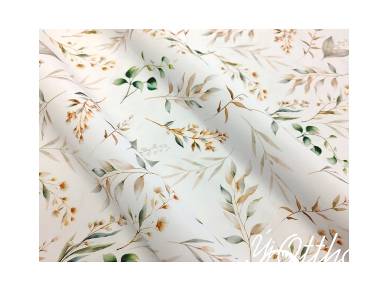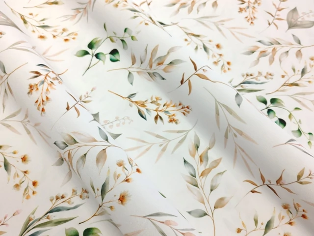 Fehér alapon elegáns zöld és barna-bézs mintás vízlepergetős abrosz alapanyag. Nem 100% vízálló.