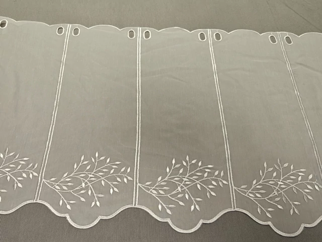 45cm magas, fehér alapon fehér ágacska mintával hímzett szablé vitrázs függöny. Könnyed függönyke mely minden korosztálynak ajánlott. Varrást nem ígényel, azonnal felakasztható. Mintaismétlődés: cca 16cm. Ajánljuk 1,7-1,8 ráncolódással kalkulálni.