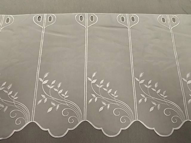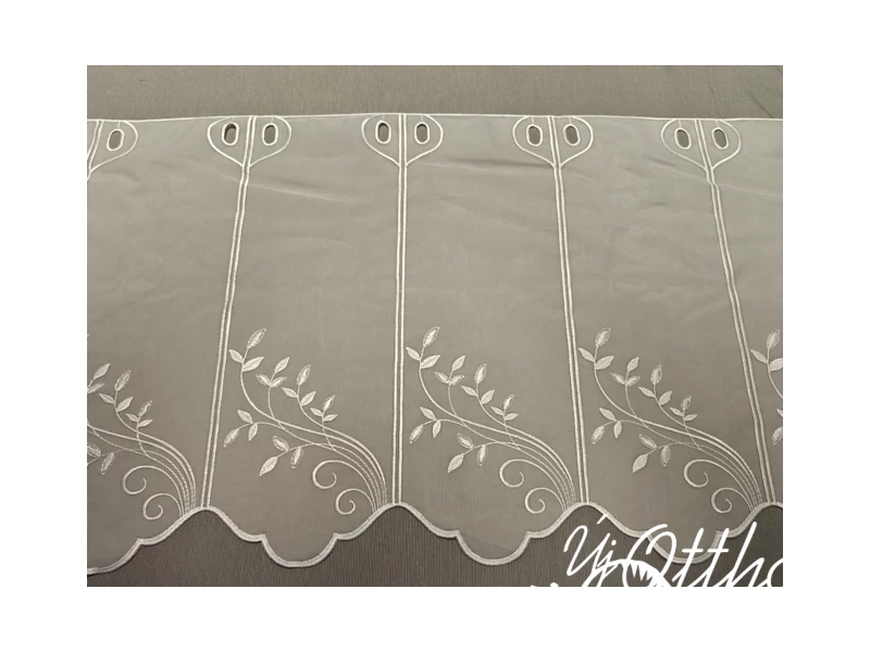45cm magas, fehér voile alapon hímzett inda mintás vitrázs függöny. Varrást nem ígényel, azonnal felakasztható. 1,7-1,8 ráncolódást javaslunk. Mintaismétlődés: circa 15,5cm