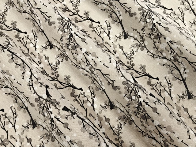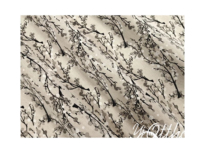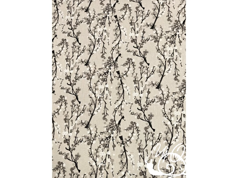 Kevertszálas panama szövésű zsákvásznas alapon fekete-fehér-szürke ágas-bogas inda mintás dekor anyag. Ideális függönynek, díszpárnákhoz vagy egyéb kreatív varrós projektekhez.